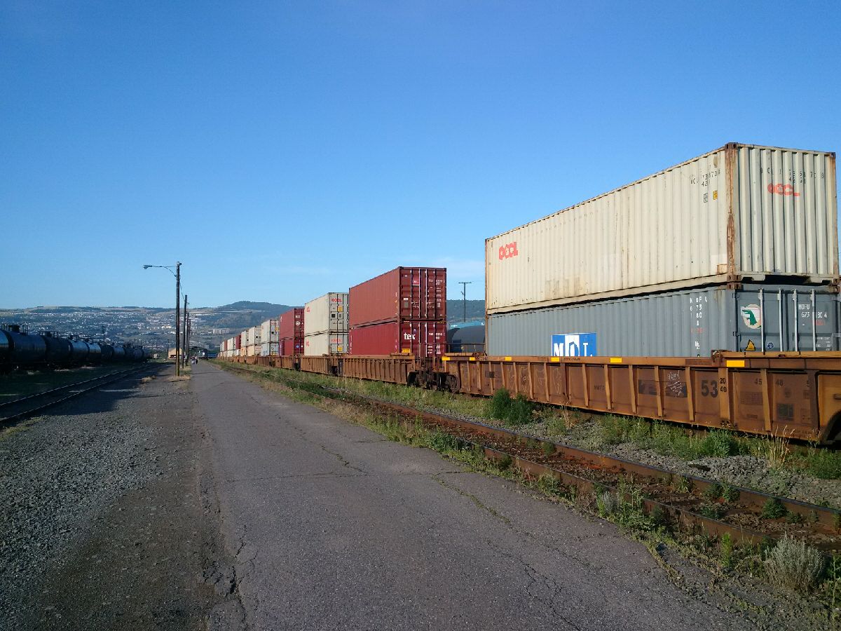 Gerade sind wir an einem vorbeigefahren, der wenn auch keine zweistoeckigen Container, so doch immerhin die Kleinigkeit von 200 (!) Waggons hatte – zwei Zugmaschinen vorn, zwei in der Mitte!