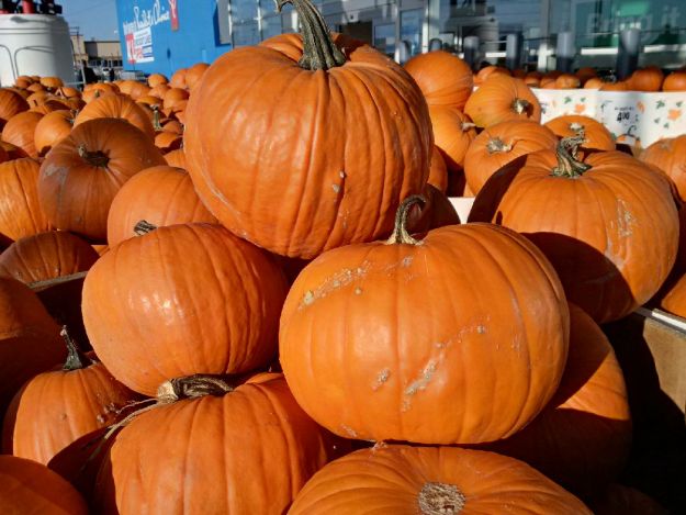 Das ist das typische Herbstbild vorm Superstore: Unmengen Kuerbisse fuer Halloween oder zum Essen (wobei hier irgendwie niemand sie suess-sauer einlegt, merkwuerdig). Halloween ist zwar noch was hin, aber es gibt schon Kostueme etc.pp., und das ist auch ok. Aber was ich auch gesehen (nicht fotografiert!) habe, waren grosse Deko-Weihnachtsmaenner – gruselig!