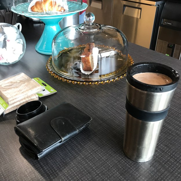 At the market or rather in town or rather all over the place, as I learned later, the power was out after a major thunderstorm that missed us, luckily. Set up in the dark, I had, smartly, taken a towel with me and I needed it. Then coffee at Travis‘ Tall Timber Coffee Shop.