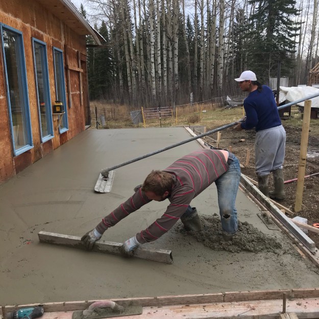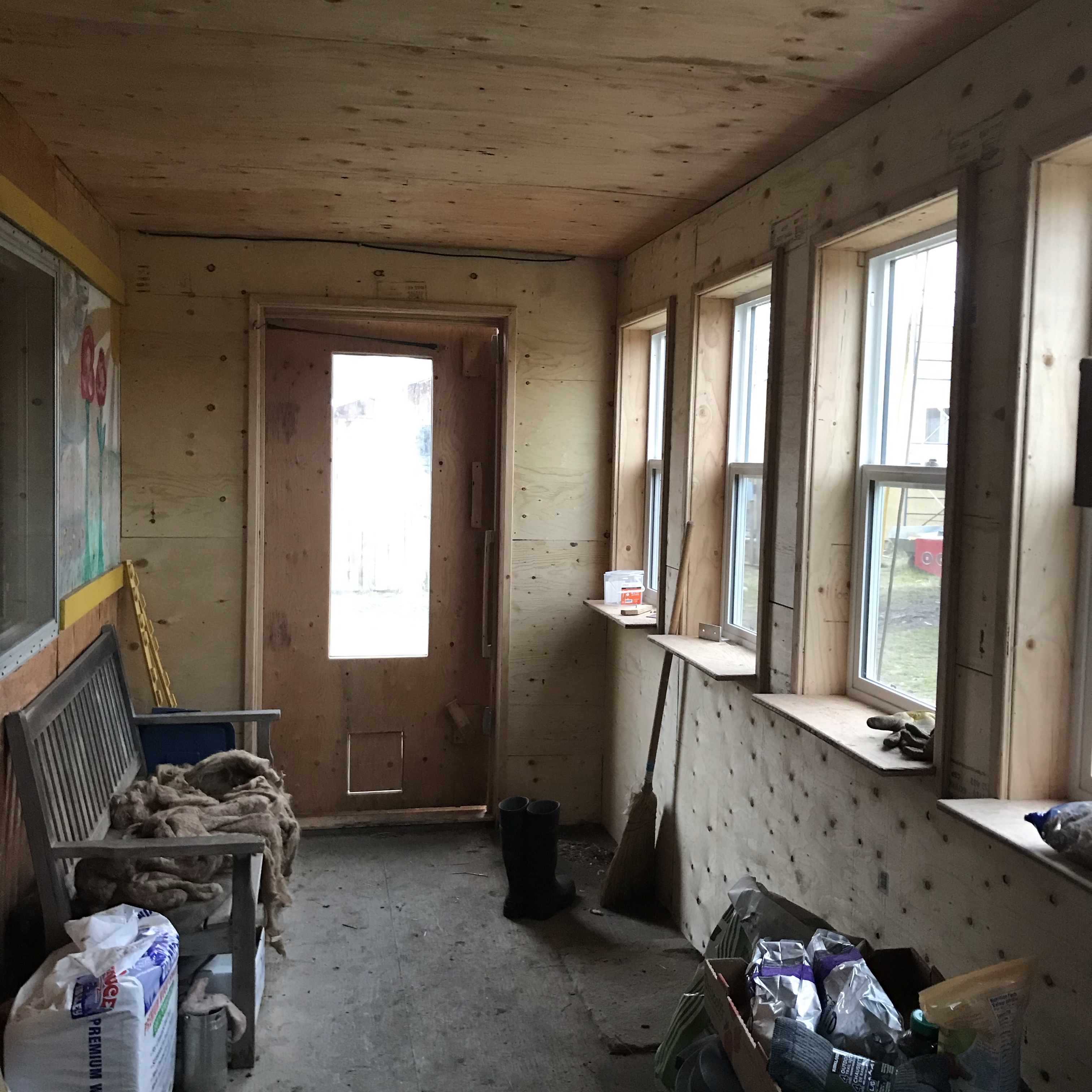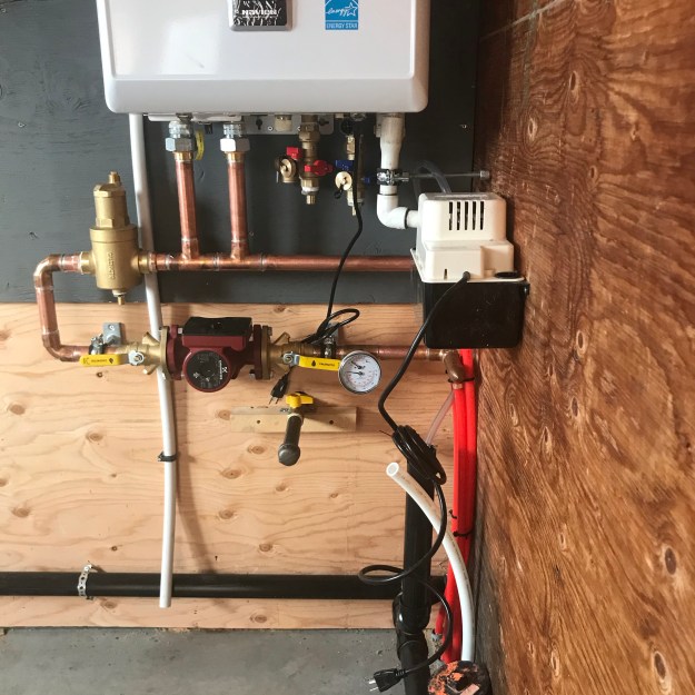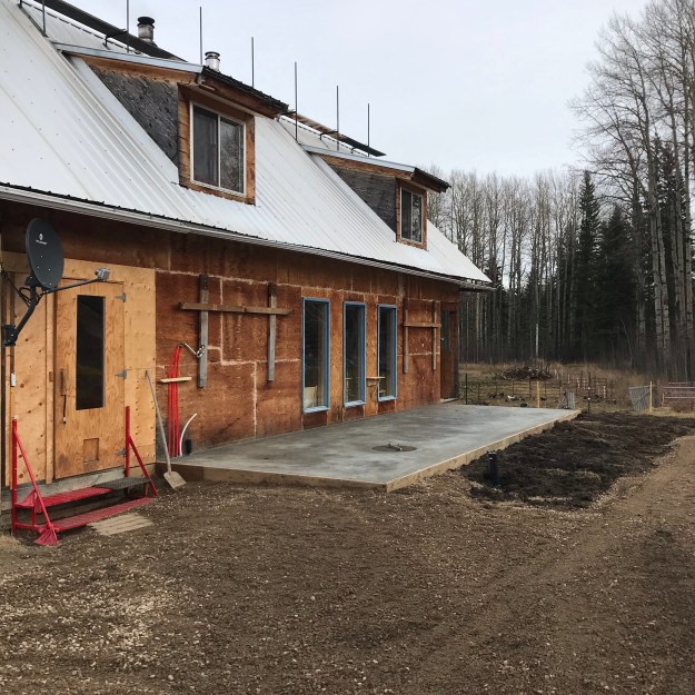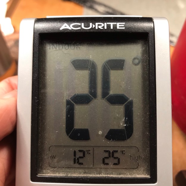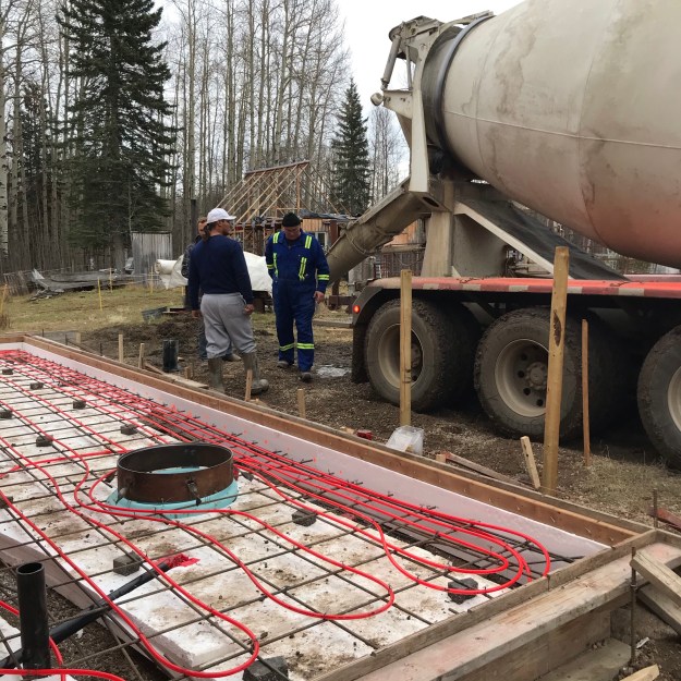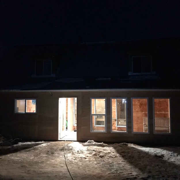 Auf dem Heimweg kam der Anruf von Klempner Rob: Wir sind soweit fertig, die Heizung laeuft und sollte auch noch eine Zeitlang durchlaufen, um die Bodenplatte aufzutauen. Als ich nach Hause kam, bin ich gleich in den Anbau, der zu dem Zeitpunkt noch nur von aussen zugaenglich war. Der Fussboden war ganz leicht warm! Das Thermostat auf 20 Grad gestellt.