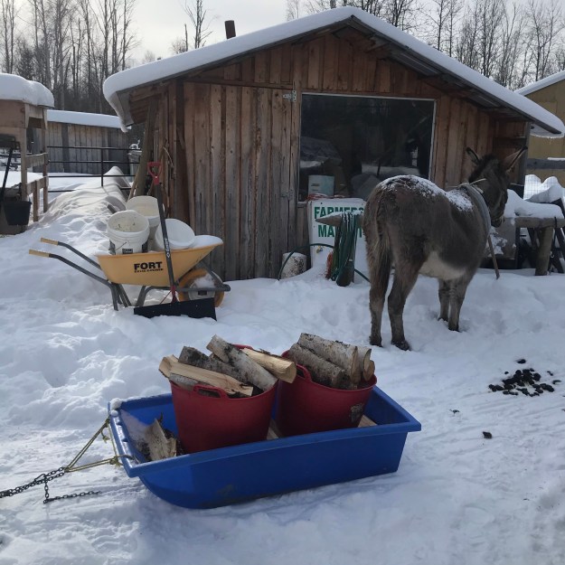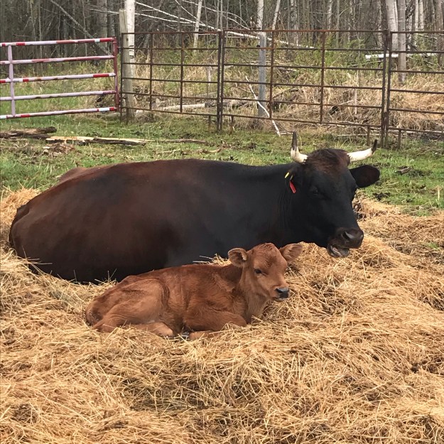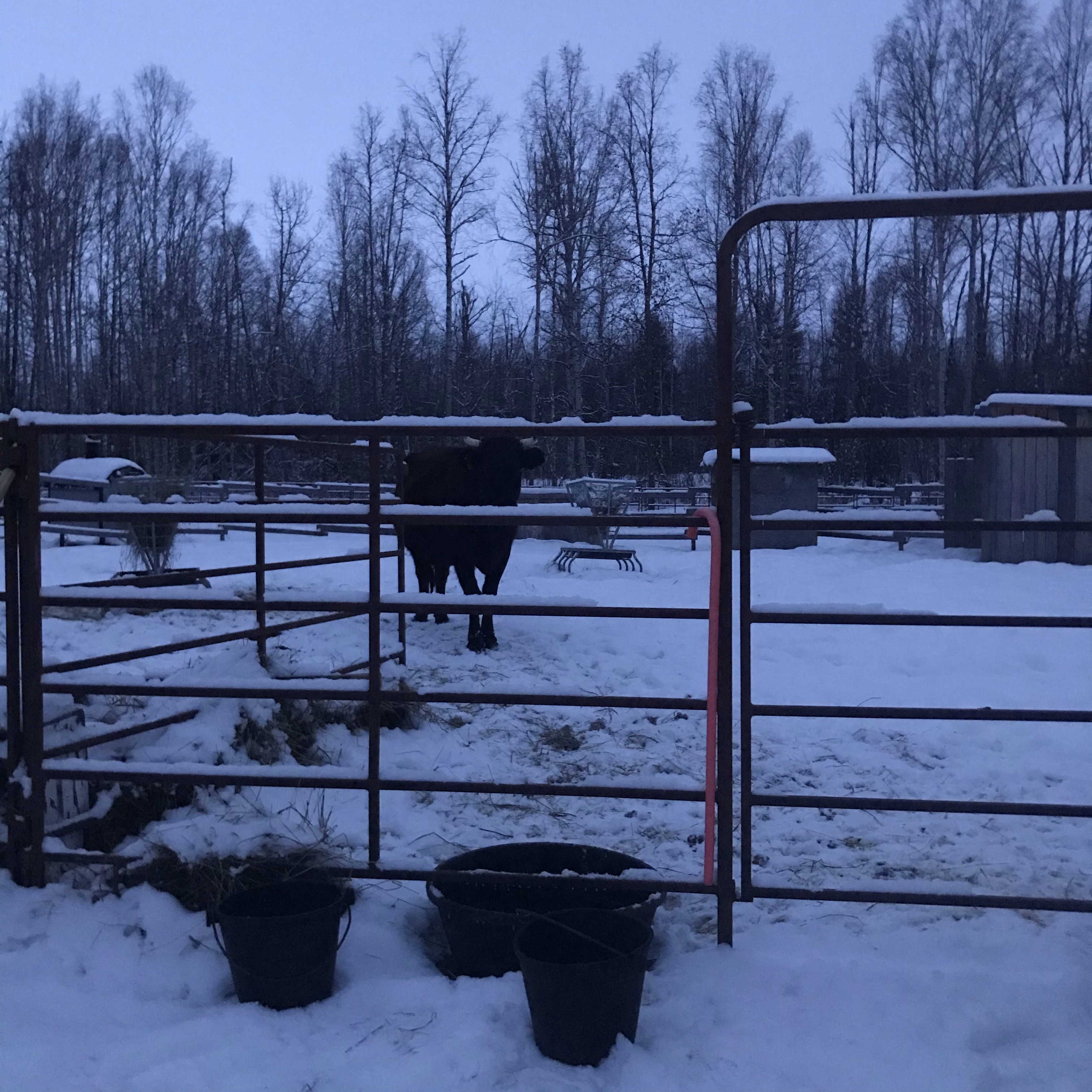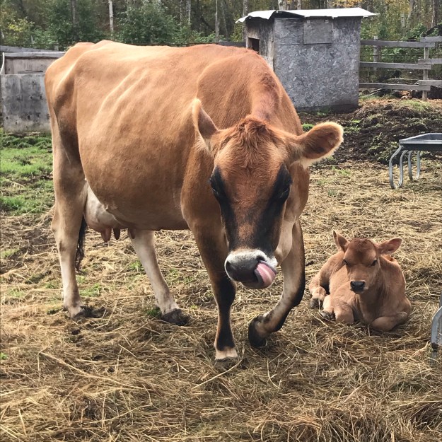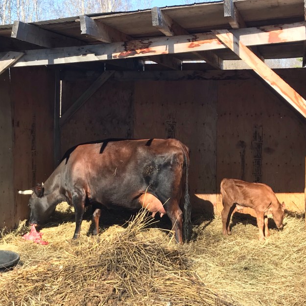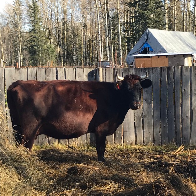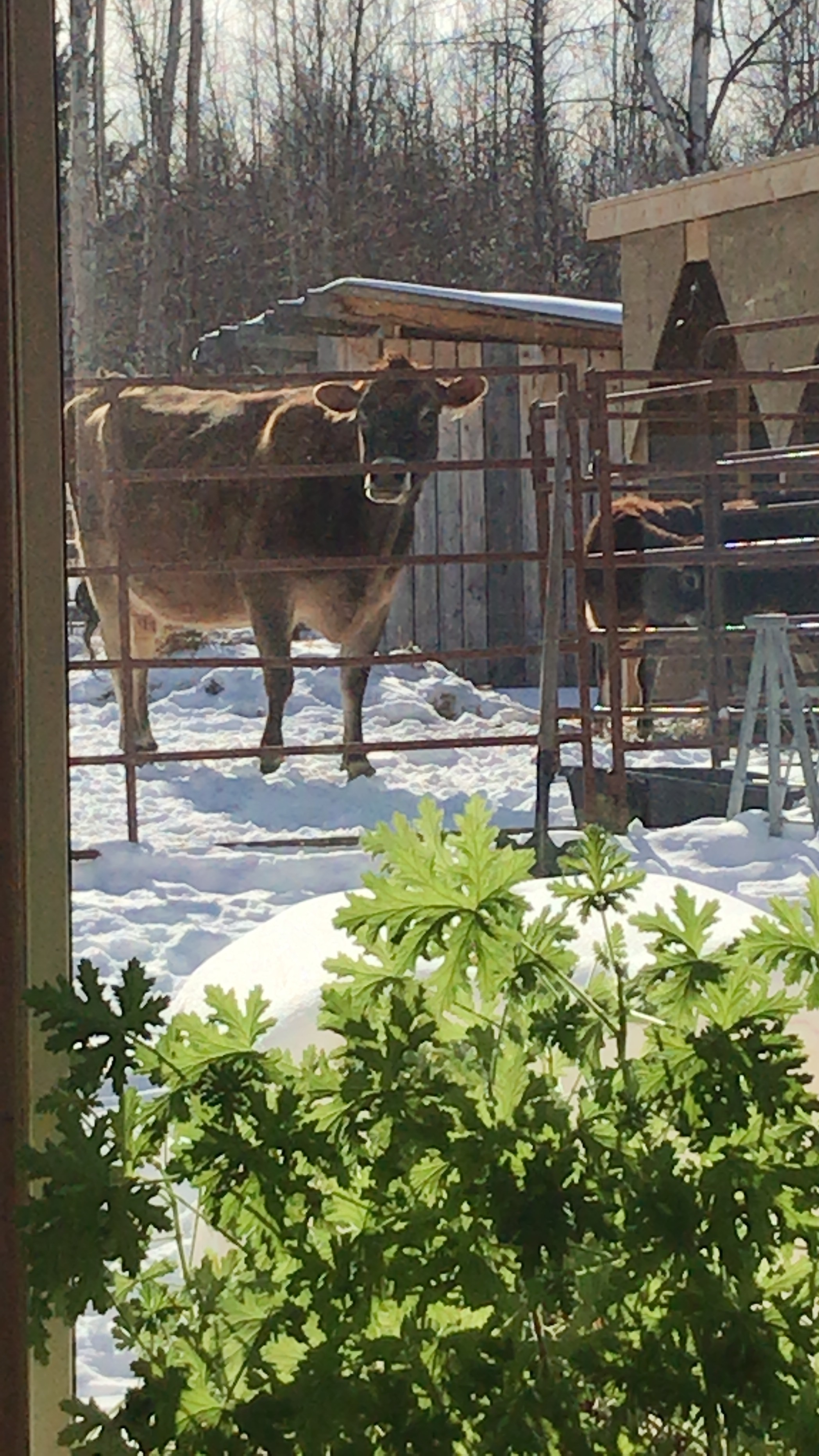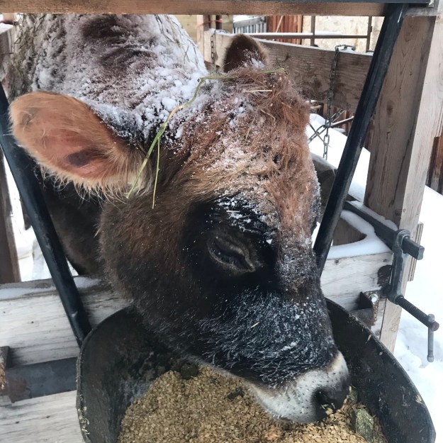 Waere nicht noetig gewesen, kam aber nicht unerwartet. Bis auf ein sowieso kraenkelndes Huhn, das Gereon ins Jenseits befoerdern musste, gab es keine Verluste – aber verflixt, es war kalt. Ich habe tapfer durchgemolken, nur einen Tag ausgelassen, den ich fuer den kaeltesten hielt. War falsch, es kam noch kaelter. Die arme Tilda hatte ein bisschen Hauterfrierungen an den Zitzen, weil das Kalb die natuerlich nicht abtrocknet, wenn es getrunken hat. Brontë hat eine Haut wie Leder, was ihr sehr gut durch den Winter hilft. Einer meiner kleinen Finger hat auch etwas gelitten, die Haut an der Spitze fuehlt sich sehr merkwuerdig an, aber es ist schon wieder viel besser.