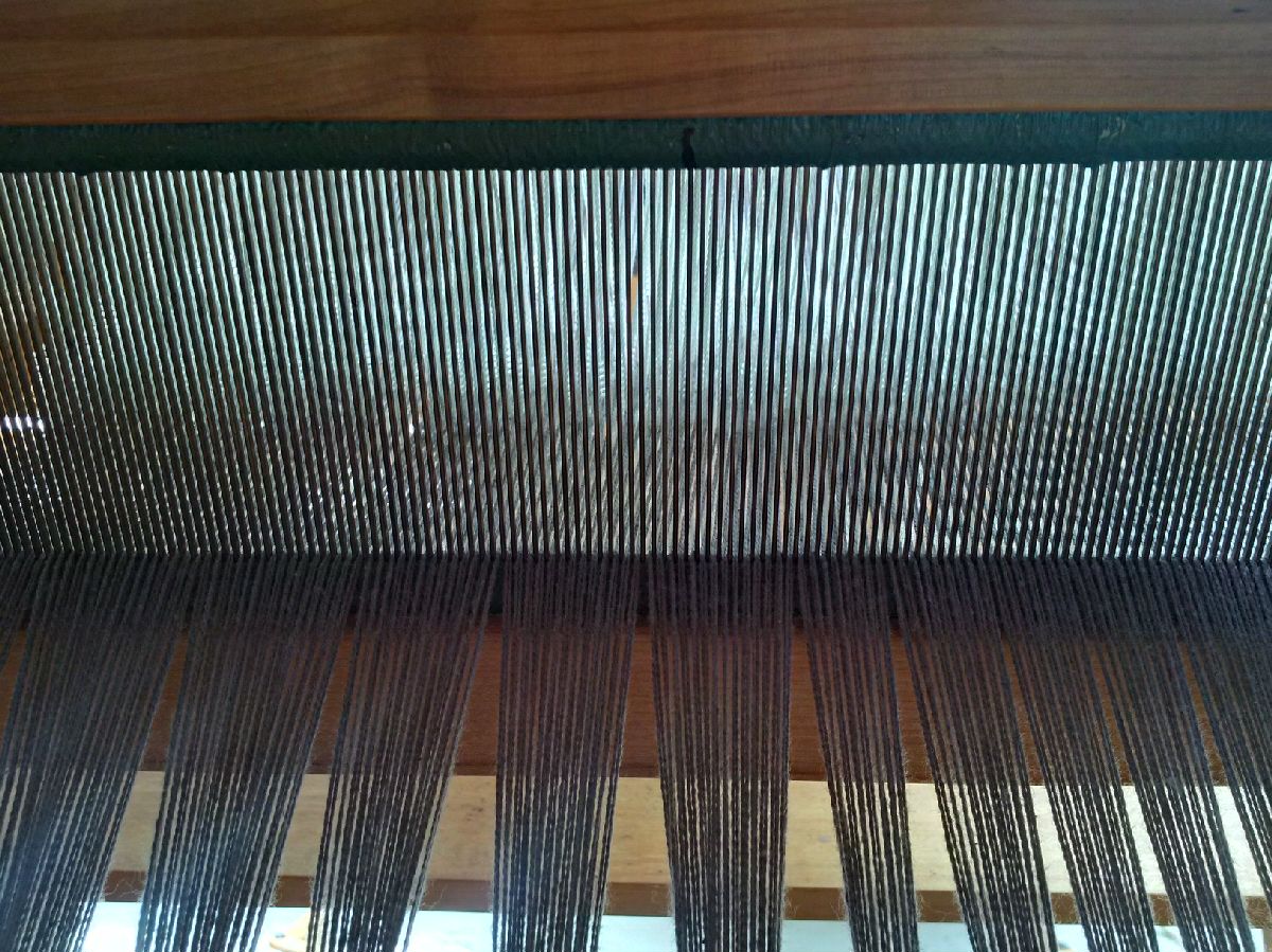 All ends threaded, tied, at an even (so I hope) tension, 1′ on this 20″ or so loom. Maybe I can start weaving tonight.