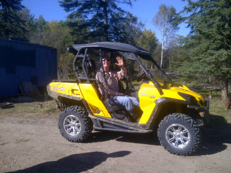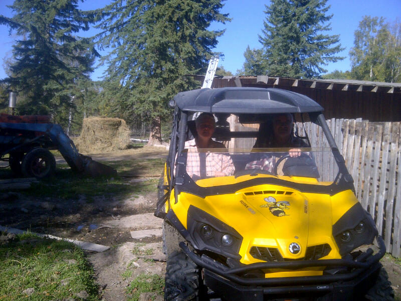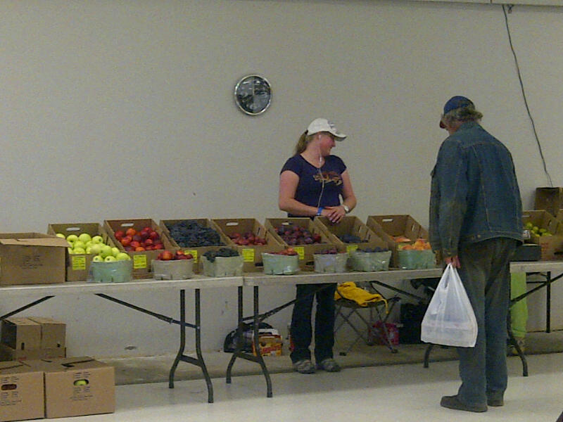 Hier sieht man ein bisschen was von den hutterern: Im hintergrund eine der aelteren damen, shucking corn, also mais schaelend. Im typischen dunkelbunten selbstgenaehten (sie moegen nicht fotografiert werden). Die hand mit dem handy rechts gehoert dem neuen gemuese-chef der hutterer. Handys sind auch bei denen sehr, sehr wichtig. Er zeigt mir gerade das foto eines baeren, der bei ihnen vorm haus geschossen wurde – der dritte schon in diesem jahr. Es gibt wenig beeren, und so kommen die baeren naeher.