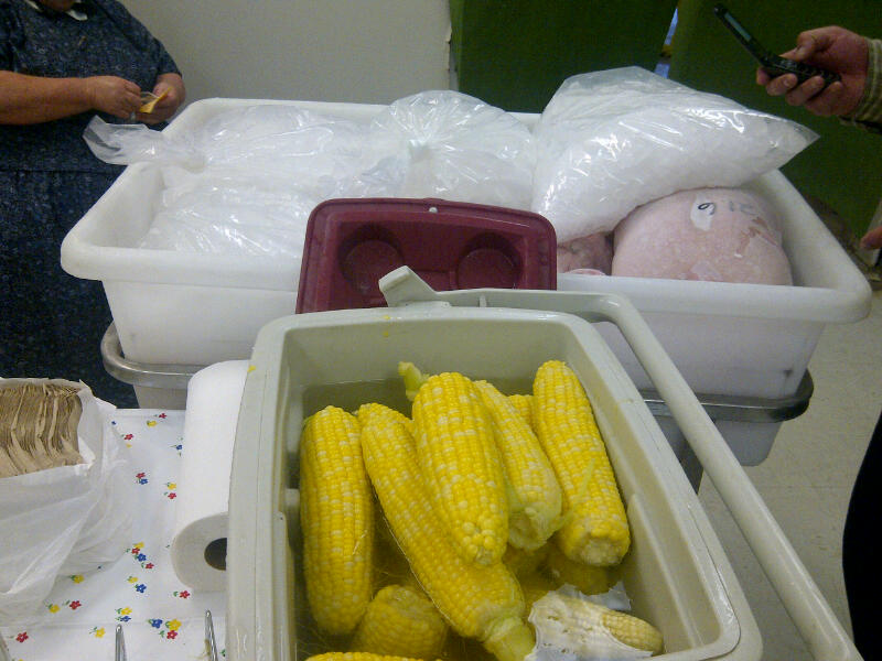 Na, und dann der wirklich superleckere mais! Wird draussen auf propanbrenner im grossen kessel gekocht, in der thermobox in warmem wasser gelagert, in einem klumpen butter gerollt und dann als sehr fettige angelegenheit abgeknabbert. Ausgezeichnet!!