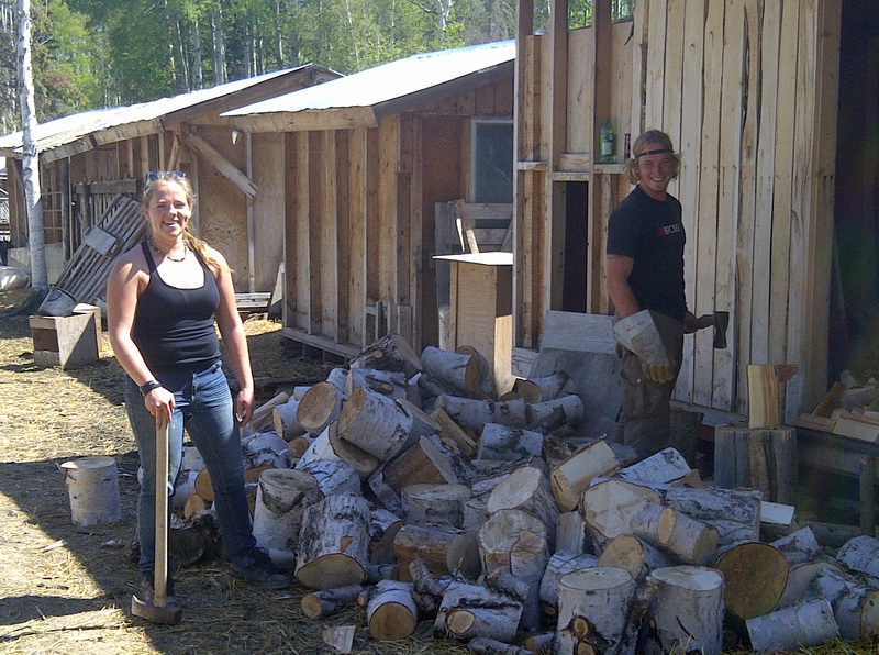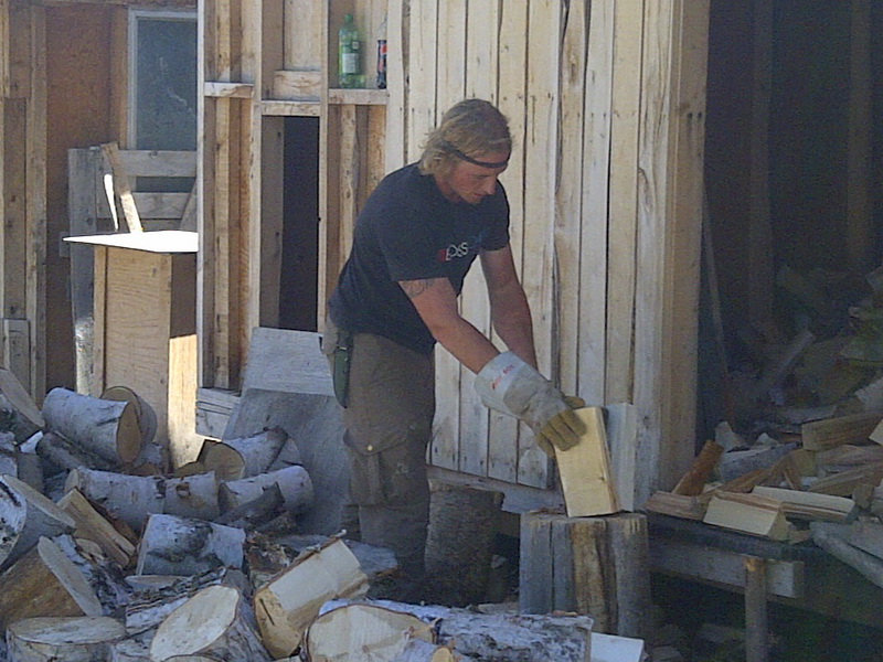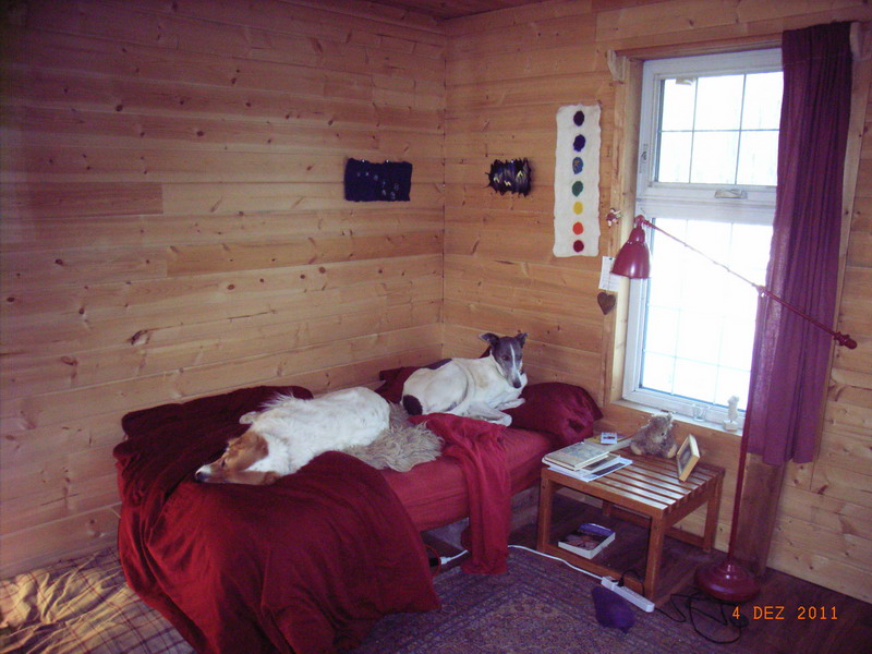 Jetzt sind wir seit sechs Jahren auf unserem Land. Nach zwei Jahren in einer unisolierten „Kueche“ ohne Fussboden und einem zwar isolierten, dennoch nicht immer frostfreien „Schlafzimmer“ (von den ersten beiden Monaten auf der „Empore“ des Planengebaeudes wollen wir jetzt mal gar nicht reden…) stieg meine Hochachtung fuer die Frauen, die dies alles vor mir durchgestanden hatten, ins Unermessliche. Im Gegensatz zu mir hatten diese Wunderwesen kein Telefon, kein Auto, keine Nachbarn mit Heizung und Dusche. Und die meisten hatten Kinder zu bekommen und/oder aufzuziehen. Hut ab! Dennoch war ich mehr als froh, als wir im Dezember 2008 in das vom Herrn Chef mit Unterstuetzung von Freunden, Bekannten, Nachbarn etc. selbst gebaute Haus umziehen konnten. Natuerlich war es mehr oder minder noch ein Rohbau. Und, fast ebenso natuerlich, hat sich daran nicht viel geaendert… Kann man auf dem Foto an den nach wie vor im Urzustand befindlichen Sperrholzplatten erkennen, die theoretisch irgendwann mit „schoenem“ Holz verkleidet werden sollen. Ich bezweifle, dass ich das erleben werde. Wirklich wichtig ist es auch nicht.