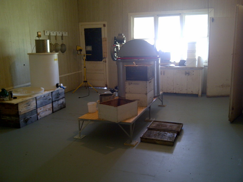 So fing es an im Honey House: Ordentlich gestrichener Fussboden, Schleuder, Tank. Siebe an der Wand, sehr schoen.