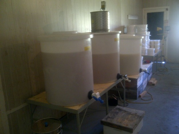 Ungefaehr einen Monat spaeter: Drei Tanks und schon jede Menge Honig abgefuellt. Vorgestern habe ich den letzten Tank in Behaelter geleert, und wir wissen: In diesem Jahr haben wir 2661 kg Honig abgefuellt. Nicht schlecht, oder? Eine Tonne mehr als letztes Jahr.