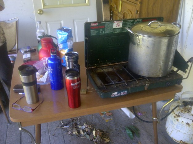 Feldkueche vorm Honey House. Es geht gar nix ohne Tee/Kaffee, und weil Besuch da war, gab’s auch kranke Chips, Schokimandeln und Diet Coke (nicht fuer mich!). Leider geht auch nix mehr ohne Brille…