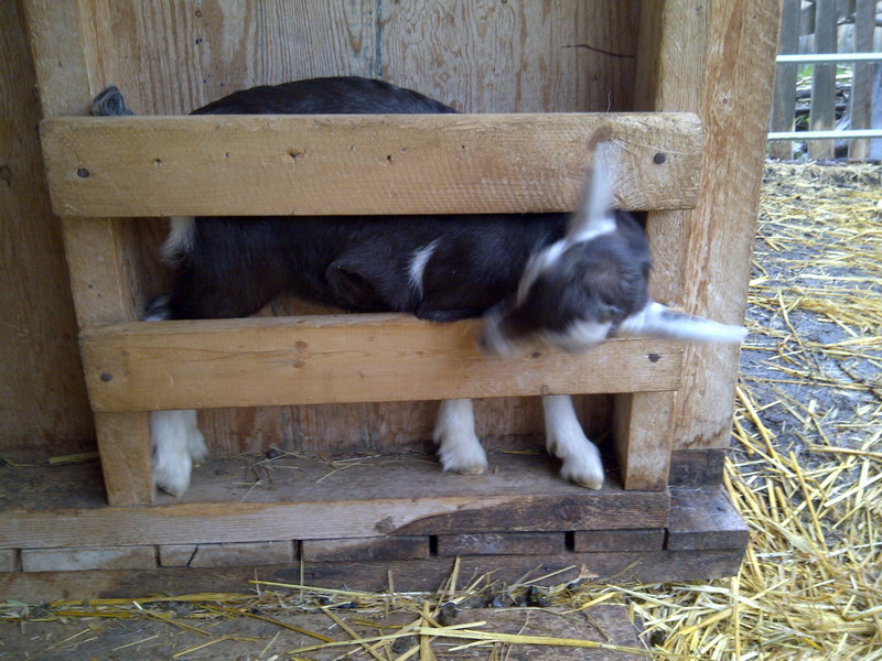 Ueberall gibt’s jetzt Jungvolk: Goesselchen, Mini-Fluff-Entchen, Mini-Elchlein (leider noch nicht auf unseren Fotos), immer noch kleine Ziegen natuerlich, von denen manche sich kunstvoll verheddern, so dass ich zum Brecheisen greifen muss: