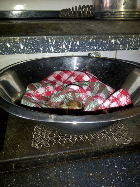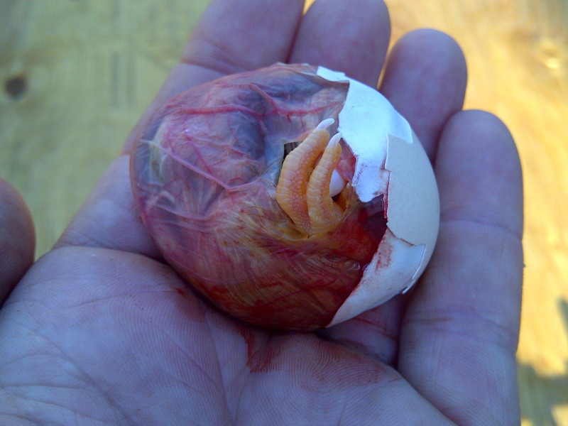 Gleich halb zwoelf. Ich hab noch nichts wirklich Lobenswertes getan, ausser vielleicht meinem kardiologisch sinn- und schwungvollen Gang mit den Hunden heute morgen. Aber nach meiner Rueckkehr guckte ich mal nach den Eiern, die von zwei Hennen mehr oder weniger gemeinsam ausgebruetet wurden. Vor zwei Tagen waren sechs Kueken geschluepft, und anscheinend waren die Eier der einen Henne spaeter angebruetet worden als die der anderen. Dennoch verliessen beide Hennen mit den Kueken das Nest – Pech fuer die restlichen Eier. Eben aber sah ich, dass ein Ei von innen angepickt war. Mit meinem Wissenschaftlerhirn wollte ich doch mal schauen, wieweit die anderen Eier entwickelt waren – und da bewegte sich was. Nun habe ich den Vormittag mehr oder minder damit verbracht, dieses eine Kueken aus der Schale zu befreien, anzufeuchten, weil die Eihaut schon angetrocknet war, warmzuhalten (extra den Ofen angestocht) – und jetzt liegt es im Warmhalteofen und kaempft tapfer.