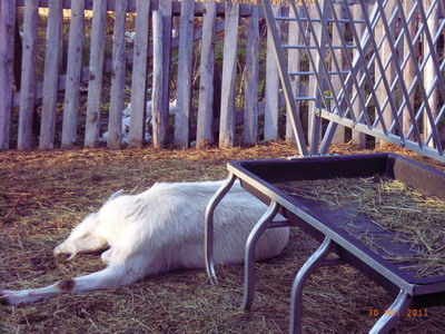 Schnell noch ein kleines Anekdoetchen aus meinem „Berufsleben“. Vorigen Mittwoch war es morgens mal wieder hektisch, nichts klappte, wie es sollte. Und zu allem Ueberfluss brach auch noch, als ich schon in Dienstkleidung und ziemlich sauber war, Mafalda aus und stand beim Bock am Zaun. Weil sie sowieso gedeckt werden sollte, fand ich es schlau, sie gleich in den Bock-Zaun zu sperren. Toerchen auf, Mafalda rein – dachte ich. Klappte aber nicht. Mafalda war widersetzlich, der Bock wollte raus, eine andere Ziegen auch, es kam zu einem kleinen Gerangel am Tor, in dessen Verlauf ich den Bock mit einem gekonnten Hueftschwung wieder hinter den Zaun schubste. Tor zu, fertig. Im Auto merkte ich, dass der Bodycheck (bockycheck…) olfaktorische Spuren hinterlassen hatte… Oh weh!! Nicht nur merkten es alle in der Praxis sofort, nein, nach der Mittagspause bat mich dann auch der Chef, doch bitte fuer den Rest des Tages nach Hause zu fahren, weil es naemlich der armen Karla schon ganz elend sei. Oh wie peinlich!!!