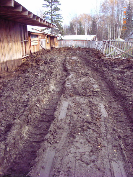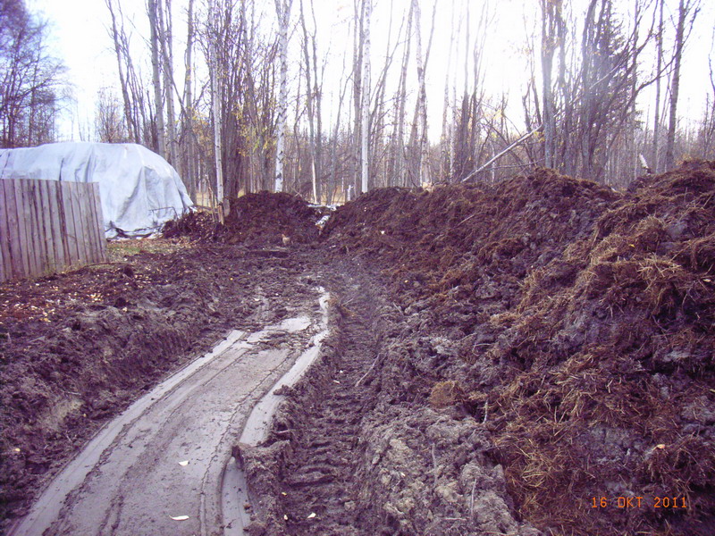 Und dann ratterte ich los. Liess sich auch ganz spassig an. Man kann da auf einer relativ kleinen Flaeche umdrehen, und das Buddeln und Abladen macht schon Laune. Nach relativ kurzer Zeit geriet ich aber an meine Grenzen. Mist aus vier Jahren ist ganz schoen kompakt! Und nach dem sehr nassen Sommer ist der Untergrund schmierig wie Seife. Und was nicht kompakt genug ist, wird von den Ketten umgewuehlt. Rolfs Devise damals in DeBolt war ja immer: No ruts! Aber jetzt haben wir welche. Ich also gab nach zwei Tagen auf und rief Chris und David an, die auch sofort zur Hilfe eilten. Nach einem weiteren halben Tag des intensiven Arbeitens erklaerte David, der ja professionell jahrelang einen Raeumer gefahren hat, dass es wirklich nicht einfach sei und der Boden eben sehr schmierig. Ich habe dann noch den Unternehmer bestellt, den ich eigentlich haben wollte, und auch sein Urteil war: zu nass. Versucht spaeter noch mal, vielleicht, vielleicht geht es, wenn alles ein bisschen abgetrocknet ist. Samstag rief dann Dusty an, um sich zu erkundigen nach dem Fortschritt der Arbeiten. Als er meinen Frust abgehoert hatte, machte er sich kurzentschlossen auf den Weg, um mit Gereon das mal eben fertig zu machen. Nachts um 11:30 haben die beiden Feierabend gemacht. Dusty sagt, er arbeitet normalerweise bis Mitternacht, nur wenn etwas superwichtig ist, macht er laenger. Aber am Samstag haben sie dann halt schon um halb zwoelf sich fuer den Rest des Tages freigenommen. Fertig geworden sind sie nicht. Das Ergebnis sieht so aus und gibt mir arg zu denken.