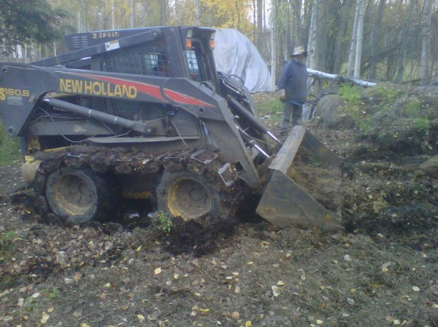 Die Ziegen ueberwintern, -fruehlingen, -herbsten ja seit unserer Ankunft hier am Snipe Lake in einer von uns immer Ziegenperk (nachfolgend „Perk“ genannt…) genannten Einfriedung mit Zugang zu zweieinhalb Haeuschen und einem Dachueberstand. Immer mal wieder hat der Chef in muehevoller Spaten- und Grabgabelarbeit einiges von dem sich ansammelnden Mist ueber den Zaun in den Garten geschaufelt. Ich auch, aber ich finde das schrecklich kreuz-schmerzlich. Dennoch sahen wir natuerlich schon laenger keinen Grund mehr. Schon im Fruehjahr, ich glaube auch schon letztes Fruehjahr, hatte ich den kuehnen Plan, einen Unternehmer mit einem Bobcat zu bestellen, um den ganzen Mist rauszuschaufeln, so wie das die Bauern hier auch immer mit ihren Corrals machen. Der Chef war aber nicht einverstanden, er will letztendlich diesen Perk dem Garten zuschlagen und die Ziegen umquartieren. Geschah aber in diesem Sommer nicht. Und vor kurzem bot „Nachbar“ Dusty (20 Minuten entfernt, Zur-Verfuegung-Steller unserer besten Bienenplaetze) seinen kleinen Skidsteer (Bobcat) an im Tausch gegen Schweissarbeiten. Der Chef sah die Moeglichkeit, richtig Geld zu sparen. Letztes Wochenende lud Dusty das Ding dann hier ab und wies mich in die groben Details des Betriebes ein.