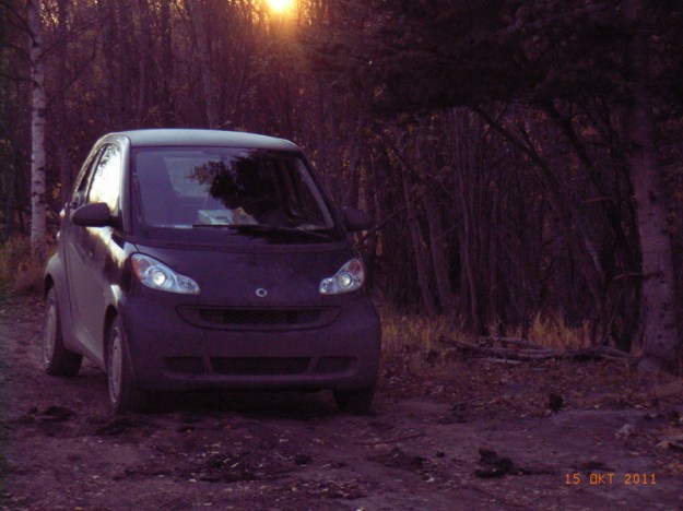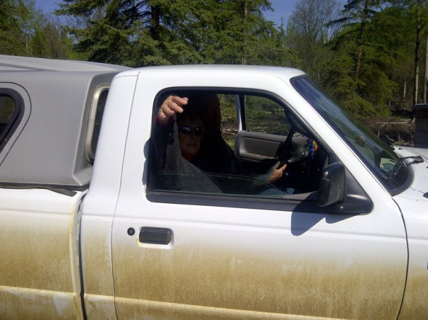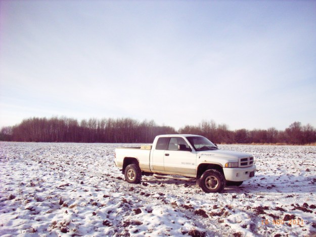 Theoretisch mache ich diese Tour zur dritten Abladestelle mit dem Diensttruck, aber der im Moment mit dem Bauern unterwegs, weil er mit dem anderen einen Hirsch gerammt hat und jetzt ohne linkes Licht ist. Der Dienststruck ist dann jetzt endlich mal ein Dodge, so ein richtiges Cowboyauto. Der zugehoerige Spruch, gern als Aufkleber auf solchen Dodges, die in der dicken Truck-Version Ram heissen, ist: What I can’t dodge, I ram.