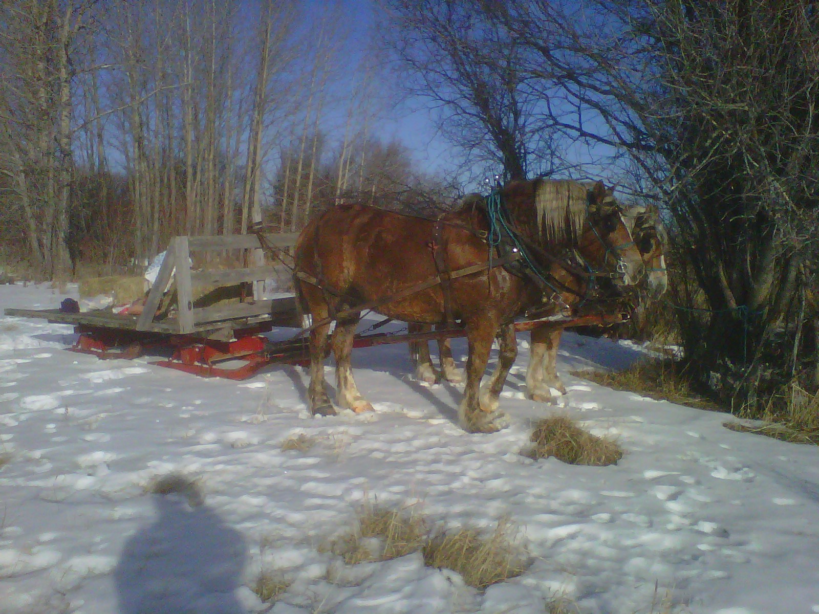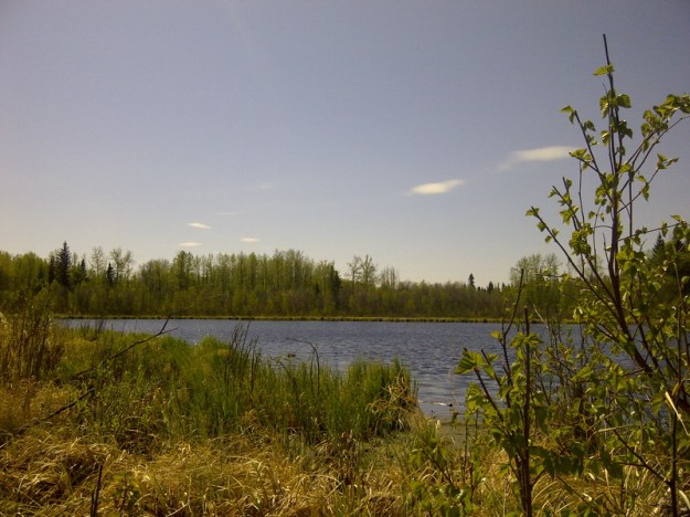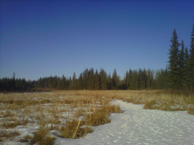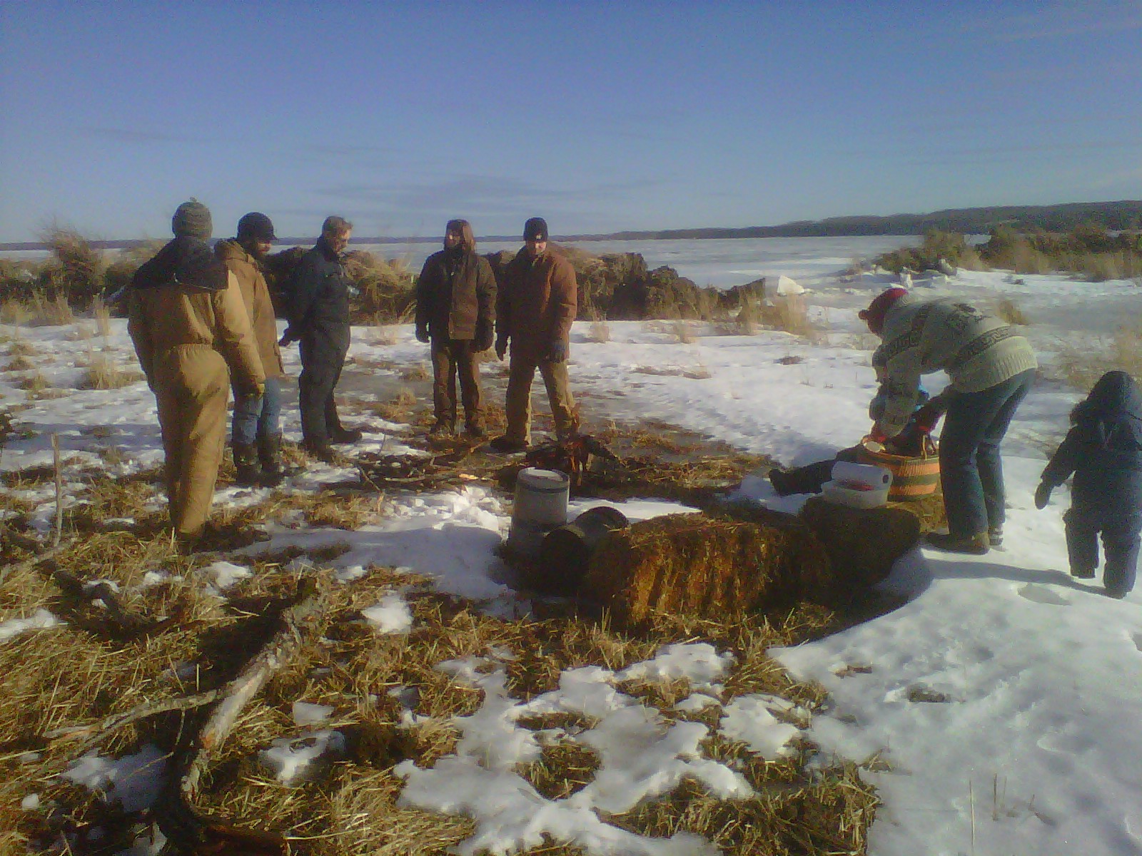 Kalt ist es inzwischen ueberhaupt nicht mehr, heute abend z.b. nur noch plus 1 Grad, und heute morgen nur minus 4, kein Wunder, dass mir immer warm ist. Vorige Woche Sonntag waren wir mit Jim und den dicken Damen unterwegs zum See. Katrin, Juri und Walter waren auch mit, dazu ein Paar aus der Naehe mit Sohn. Auch da war das Wetter wunderschoen (Fotos leider wieder nur mit Handy, und meines kann einfach keine so schoenen, oder es liegt an mir – wer weiss?). Wir haben ein Feuerchen am Seeufer gemacht und Wuerstchen gebraten und Gluehwein getrunken, Kakao fuer die Kleinen… Jim hat ja eine ganze Menge Land, etwa 14 oder 17 Quarter Sections, so genau weiss ich das nicht (zur Erinnerung nochmal: eine Quarter Section = 800 x 800 m, = etwa 64 Hektar). So brauchten wir fuer die schoene Fahrt sein Land gar nicht zu verlassen. Und so ein eigenes Stueck Seeufer ist schon was Schickes, muss ich sagen.