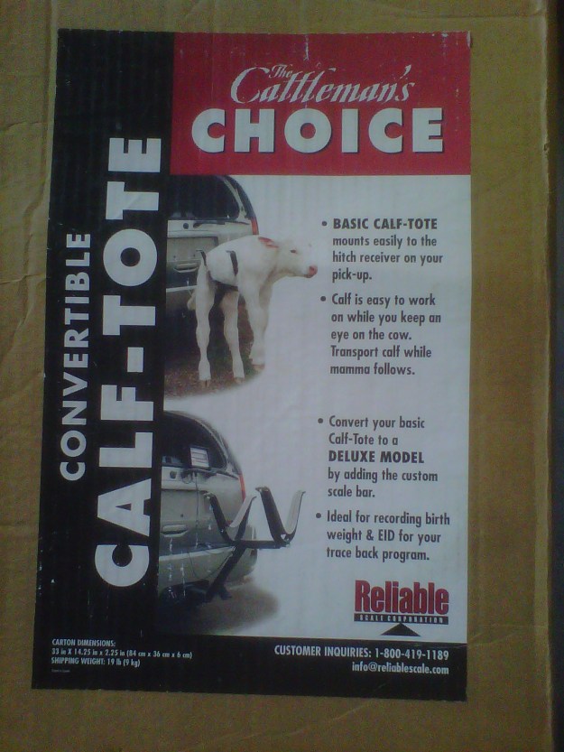 Und dann entdeckte ich heute bei den Recyclingcontainern diesen Karton. Quintessential Alberta! Bin mal gespannt, ob ich erfahre, wer von den Nachbarn das Ding gekauft hat. Wenn jemand von euch mal ein Kalb auf der Anhaengerkupplung transportieren moechte – sagt Bescheid, ich kann das Geraet mitbringen! Vielleicht gibt’s die auch zwei- bzw. dreiarmig fuer Schaf- oder Ziegenhalter…