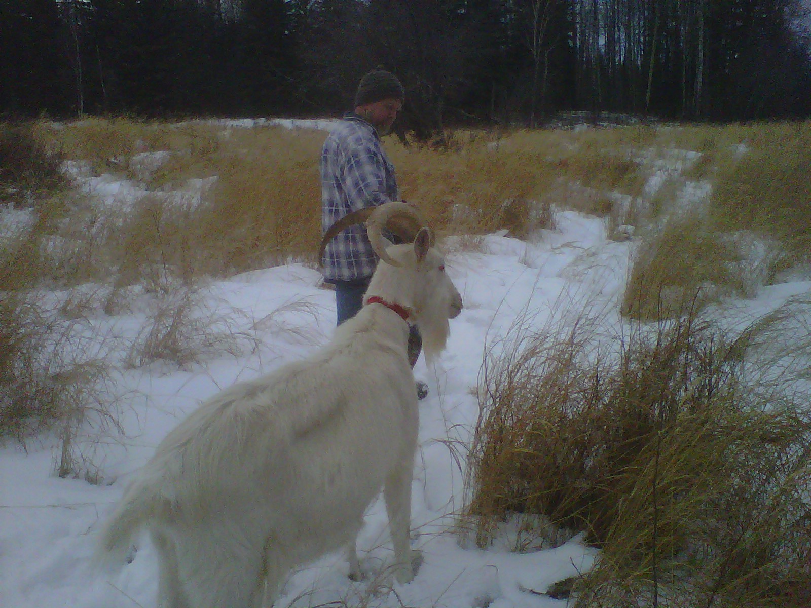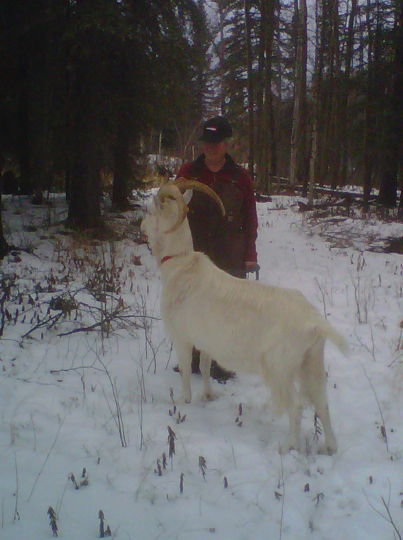 Gereon und ich waren an einem anderen schoenen Tag statt mit den Hunden mal mit Lulu, dem grosshoernigen Ziegenwallach unterwegs. Ich wusste zwar, dass er gut an der Leine geht, aber so ein angenehmes Begleittier hatte ich nicht erwartet. Besser als die Hunde, niemals wollte er sich verheddern oder auf der anderen Seite des Baumes her. Mit der Nase praktisch immer an meiner Hosentasche, die die Leckerlis enthielt, marschierte er ohne zu zoegern wie magnetisiert hinter mir her. Netter Kerl! Seinen schwarzweissen Halbbruder, der zunehmend granteliger wurde, hat dagegen ein ganz anderes, sehr endgueltiges Schicksal ereilt. Nuetzt ja nix. Grantler brauchen wir hier nicht. Aber die Netten kriegen von mir Leckerchen!