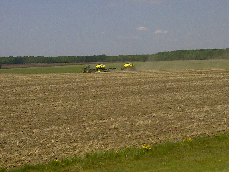 Die Bauern waren bei diesem Wetter natuerlich alle hektisch bei der Arbeit. In unserer relativen Nachbarschaft ist viel Land an grosse Getreidebauern aus den noerdlicheren Gemeinden verkauft. Und so wird kahlgeschlagen und dann mit Riesenmaschinen gearbeitet. Ich sah z.b. dieses Aussaat-Geraet: Schlepper (acht Raeder, natuerlich) – Saatgutbehaelter – pneumatisches Saegeraet – pneumatisches Saegeraet – Saatgutbehaelter. Einen ziemlich grossen Wendekreis hatte das Ding. Zum Bild gehoeren dann natuerlich auch Tieflader, die den ganzen Krams zum Feld transportieren, ausserdem Trucks mit Tanks hintendrauf und Trucks, die die Fahrer transportieren. Hier wird nicht gekleckert!