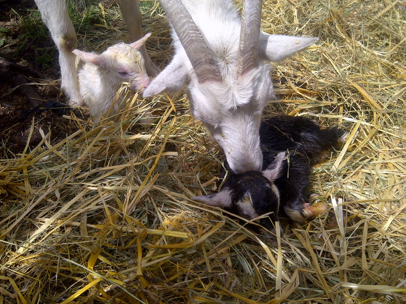 Man wartet und wartet – und oft verpasst man es doch: Mafalda legte ihre beiden diesjaehrigen Soehnchen unbemerkt ins Stroh. Helga und ich kommen also ab sofort wieder in den Genuss des exklusiven Ziegen-TV – wunderbar!