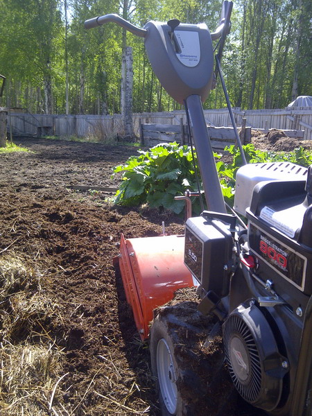 Indessen geht es bei uns langsam und kleinformatiger weiter. Die Ziegen haben sich – nicht so magisch – von sieben nach der Herdenreduktion letztes Jahr wieder auf 24 vermehrt, und es sind noch mehr im Anmarsch. Ehe-erschwerend, sag ich nur… Aber mein Herz huepft trotzdem, und zwar auf nette Weise, wenn ich sie sehe. Weil mein Garten letztes Jahr so ein Desaster war und ich dieses Jahr nicht sehen konnte, wie ich das Desaster mit meiner Muskelkraft in den Griff bekommen koennte, habe ich mir, waehrend Gatte und Schwiemu im Gebirge waren, kurz entschlossen eine Fraese gekauft. Fraesen heissen hier Tiller. Und so gibt es jetzt Nadja, und einen Garten nach Nadja-Einsatz. Ich bin begeistert! Und dann war am Sonntag noch Walter hier, und Walter und Nadja im Team sind immer noch Klasse! Er half mir, den Garten wieder ziegensicher und wahrscheinlich auch huehnerfest einzuzaeunen. Jetzt muss nur noch das Wetter mitspielen. Parallel zu meiner Nadja-Erwerbung hatte sich der Chef ebenso still und heimlich einen Traktor gekauft, der gestern angeliefert wurde. Baujahr 1953! Mal schauen, wie das so wird.